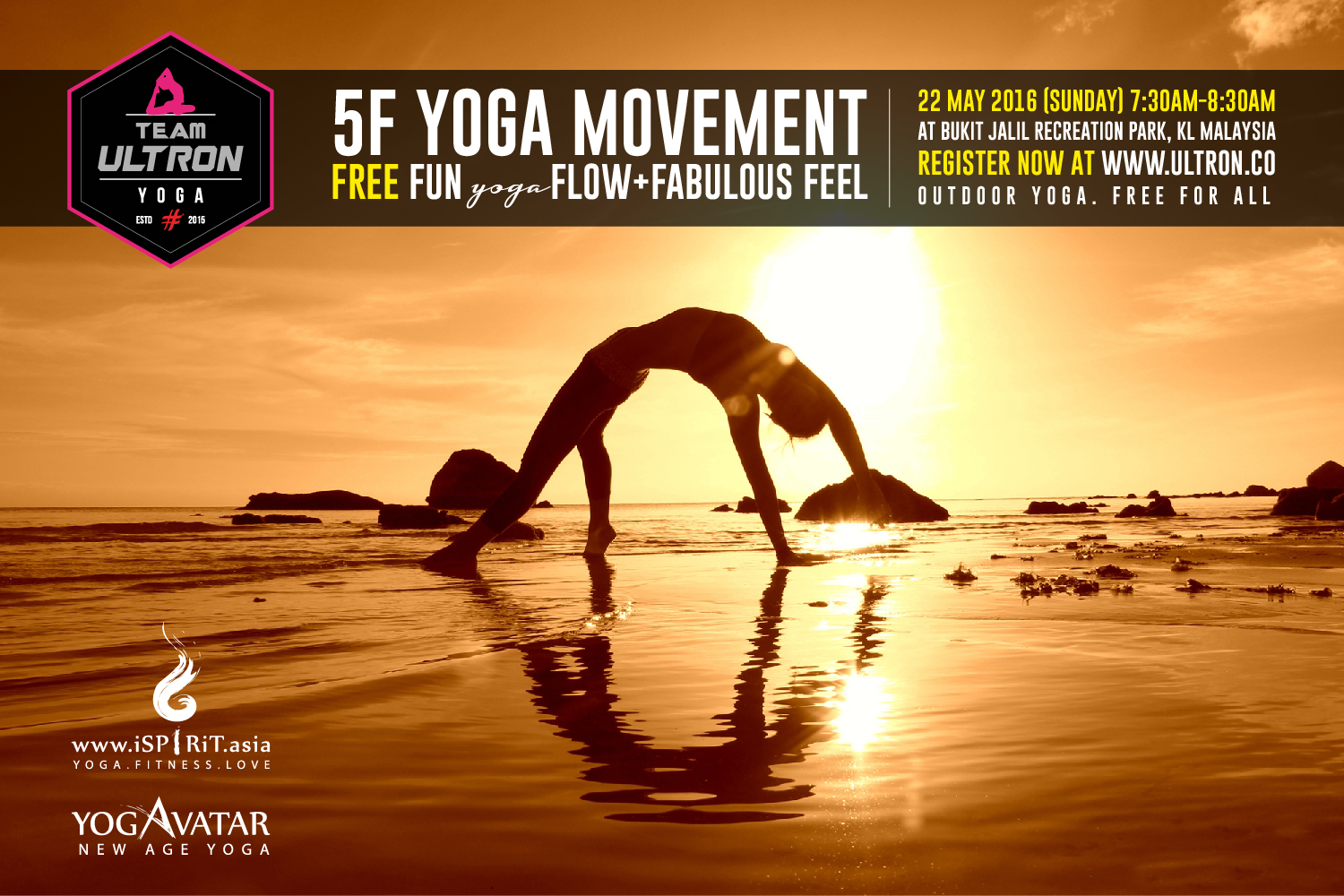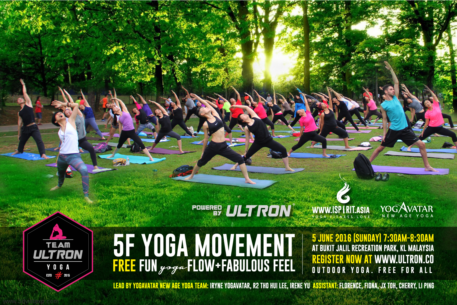 Join 5F Yoga Movement~ Free Out Door Yoga By Ultron® for a FREE FUN yoga FLOW + FABULOUS FEEL at Bukit Jalil Recreation Park, Kuala Lumpur Malaysia on 5 June 2016 (Sunday) 7:30am to 8:30am. Special brought to you by a leading local sports wear brand Ultron® (http://ultron.co/). Let’s have some fun under the sun! Sprinkle yourself in some sunlight with the perfect amount of shade from the trees, fresh air and enjoy the soulful tunes. The session will be led by Yogavatar New Age Yoga team, it is designed to be refreshing to increase physical and mental wellbeing. It’s FREE!!! All are welcome to join!!!
